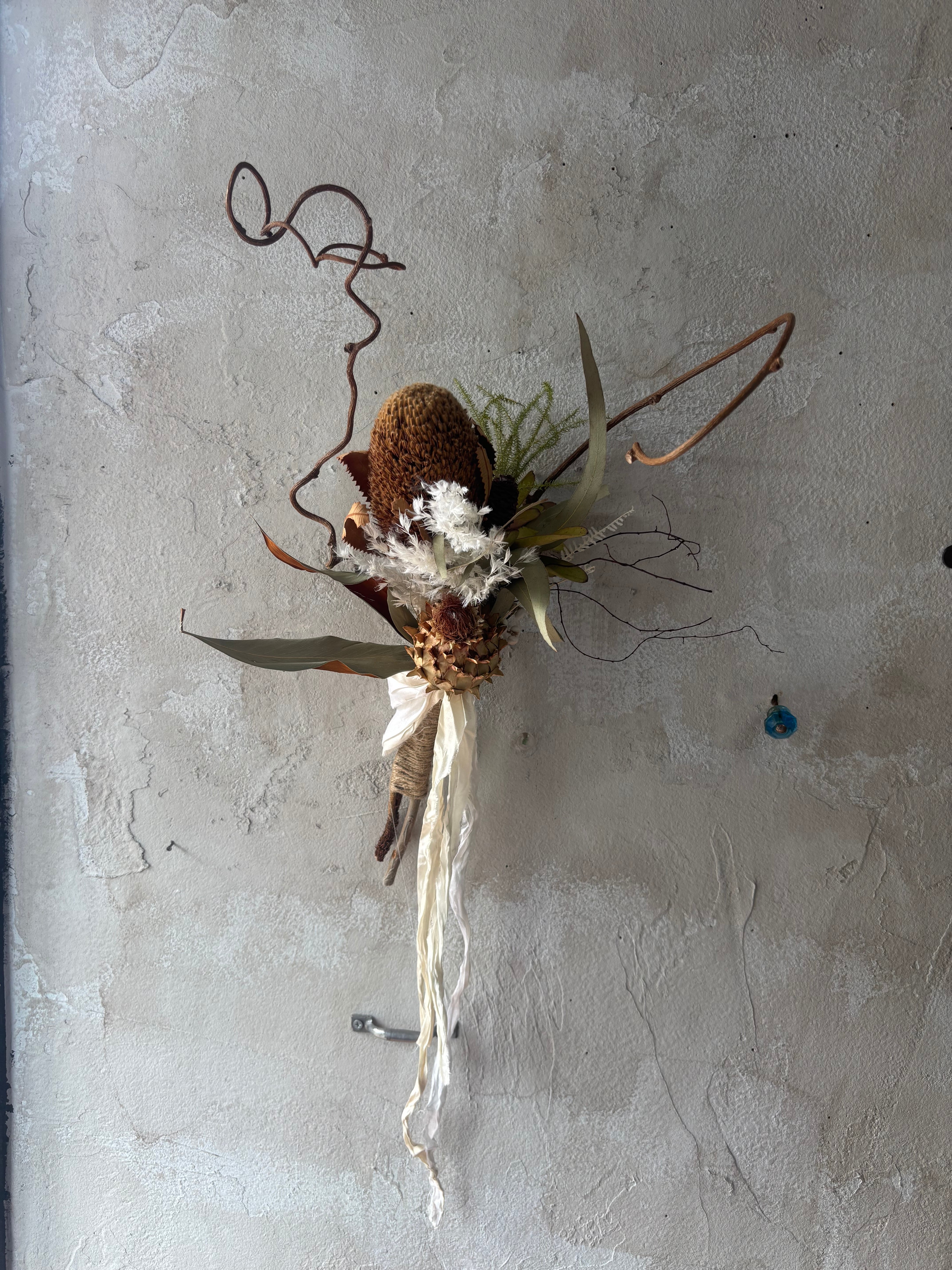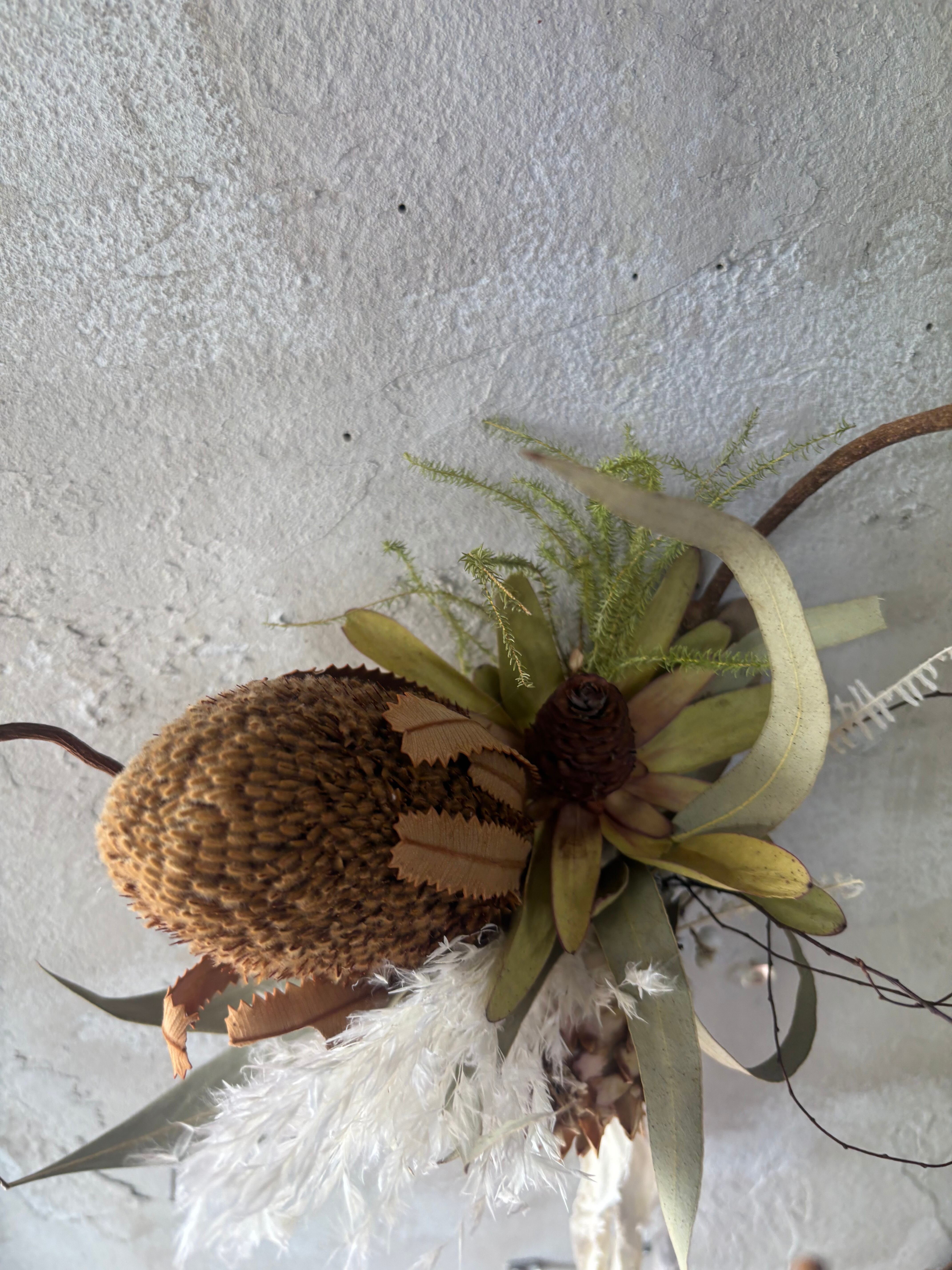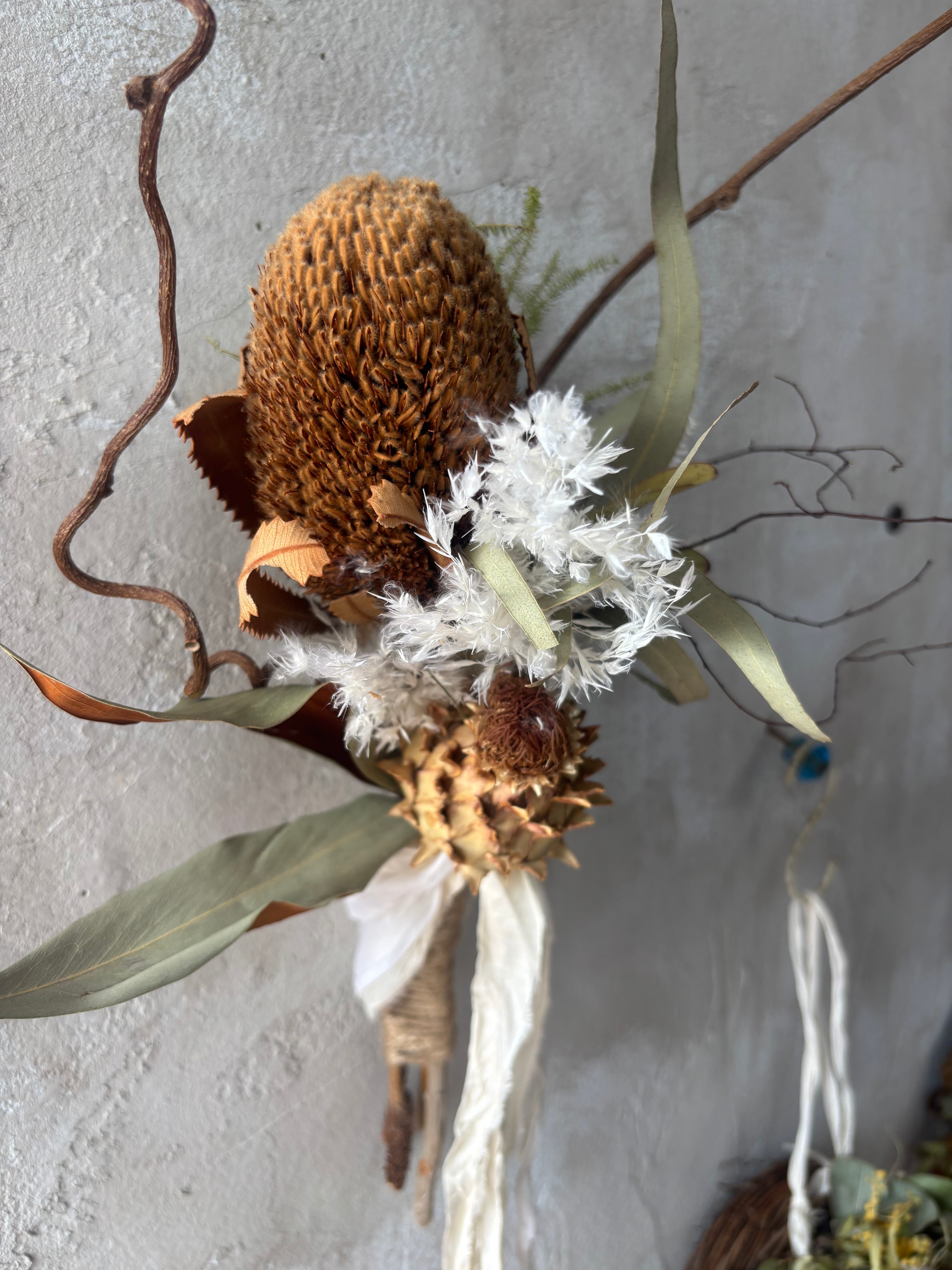 バンクシアをキウイのツルやグレビレアの葉で、アレンジしました。