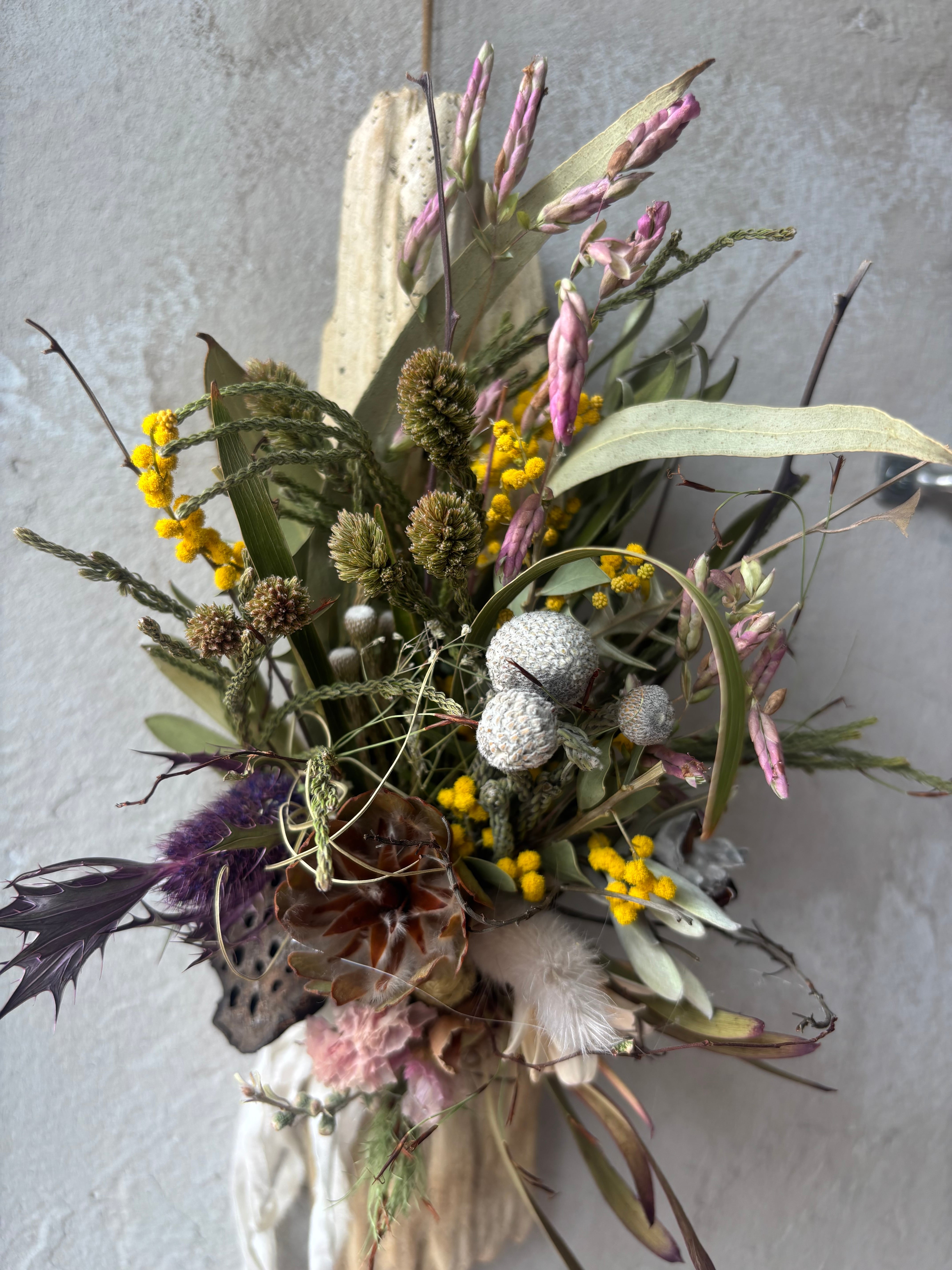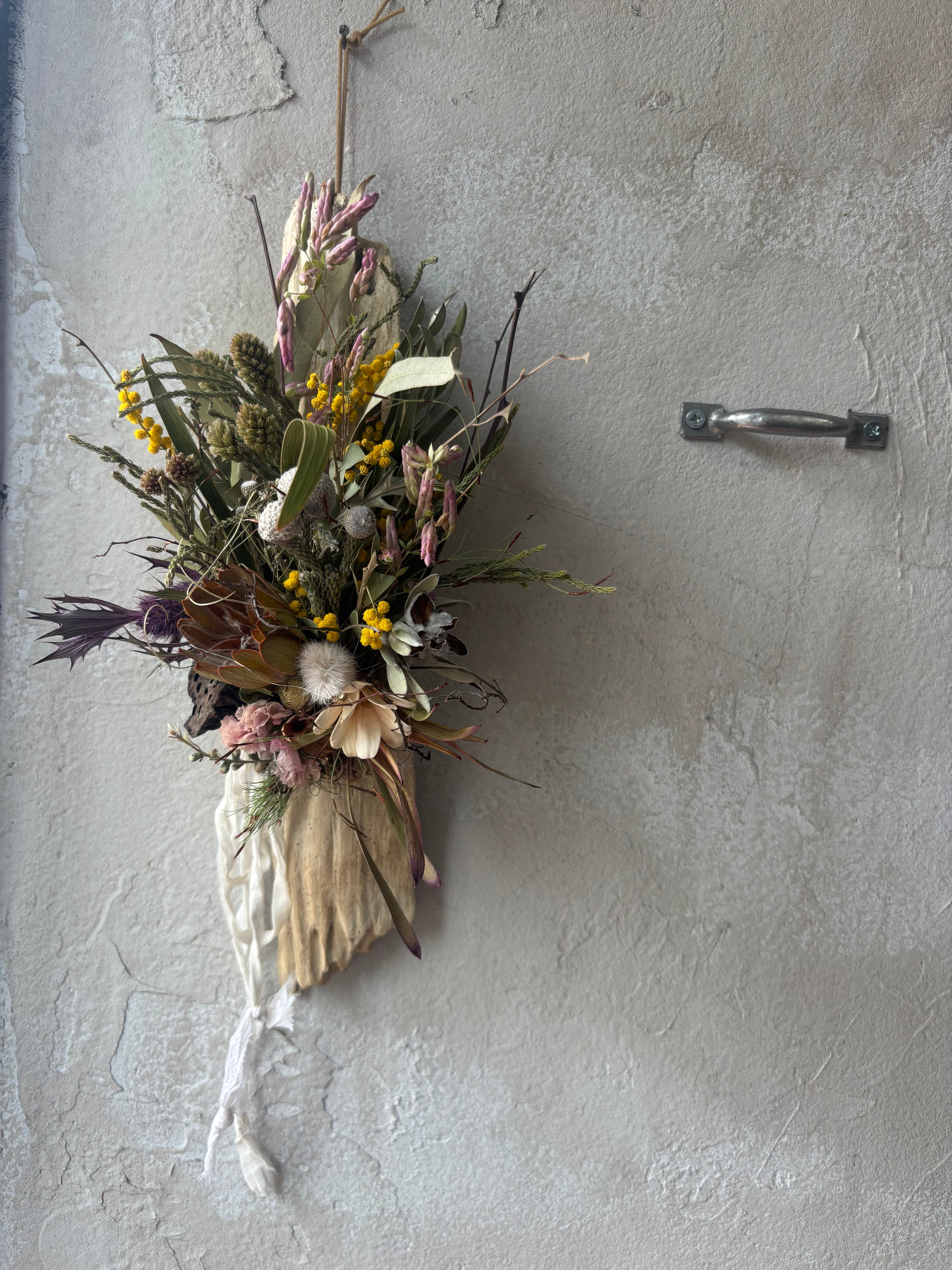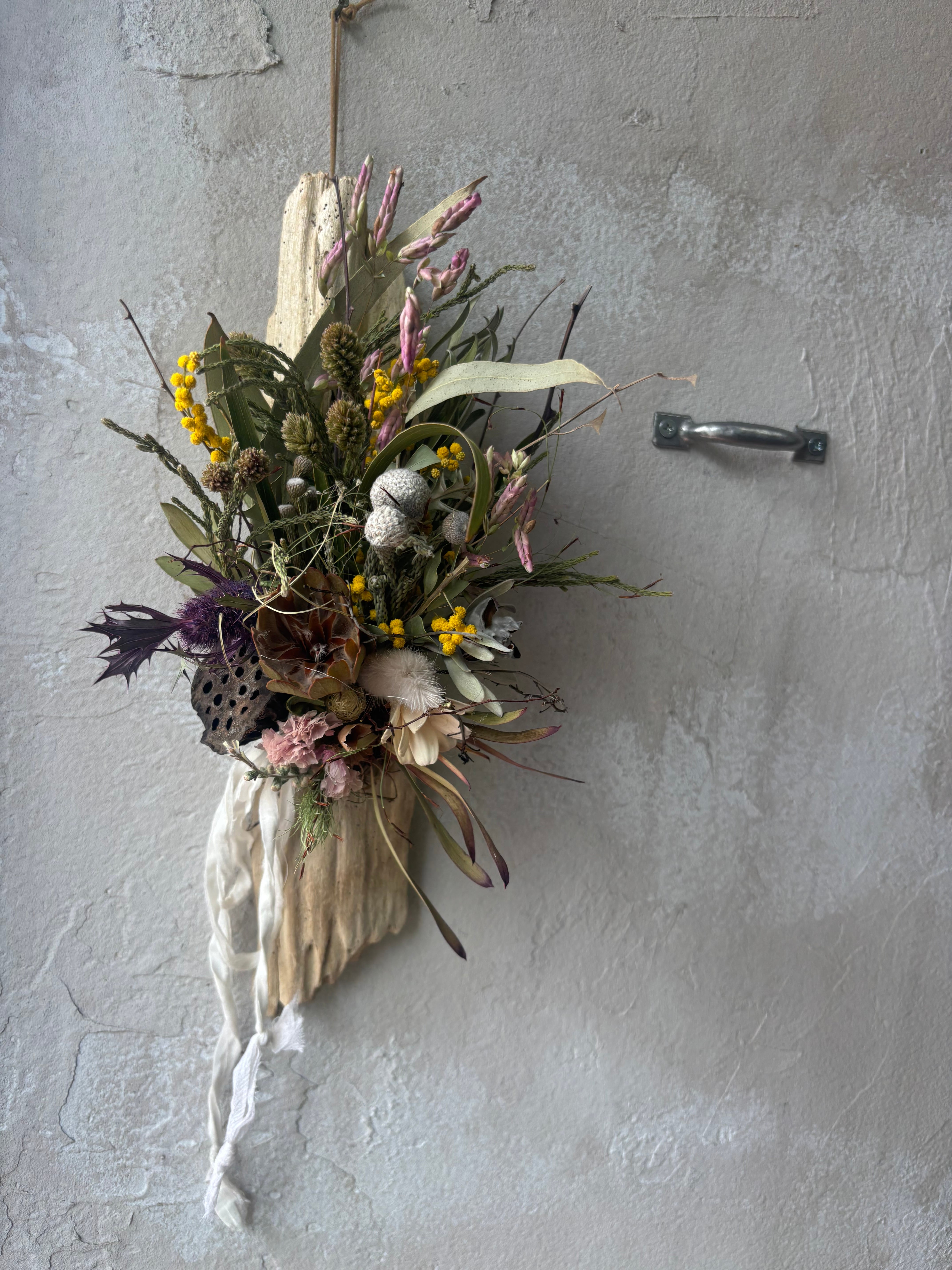 流木プレートをリューカデンドロン、エリンジューム、オレガノなどでアレンジしました。