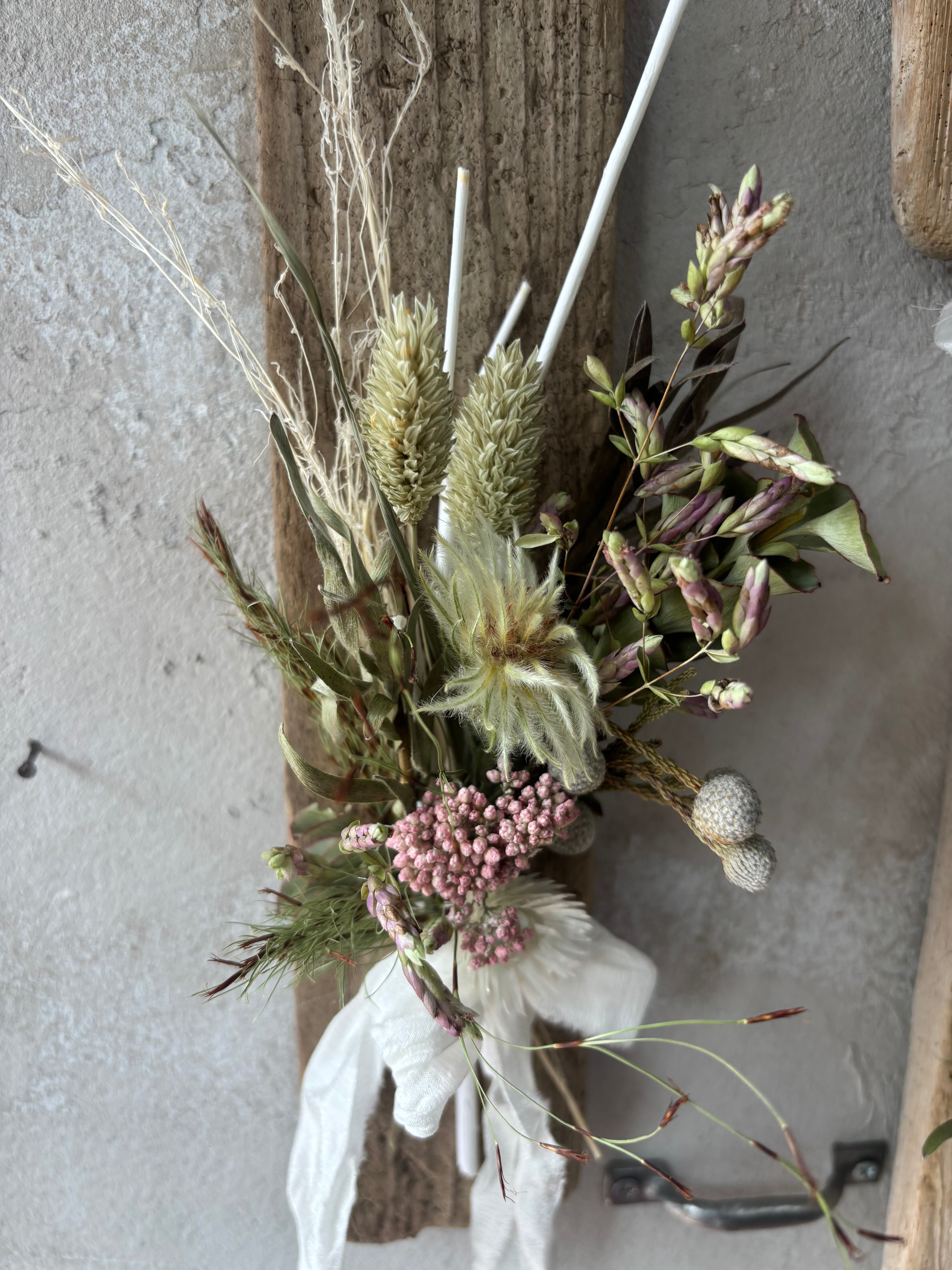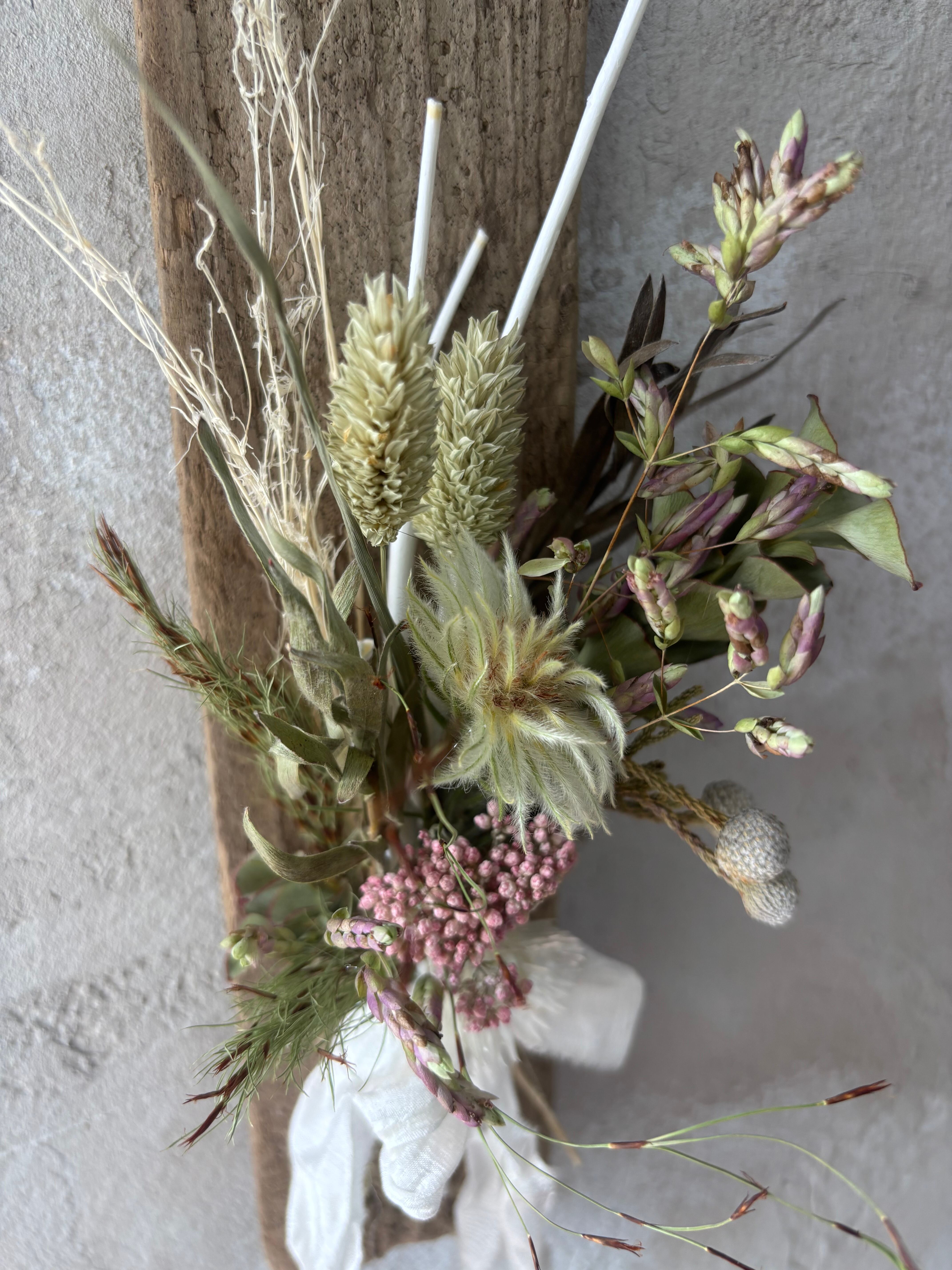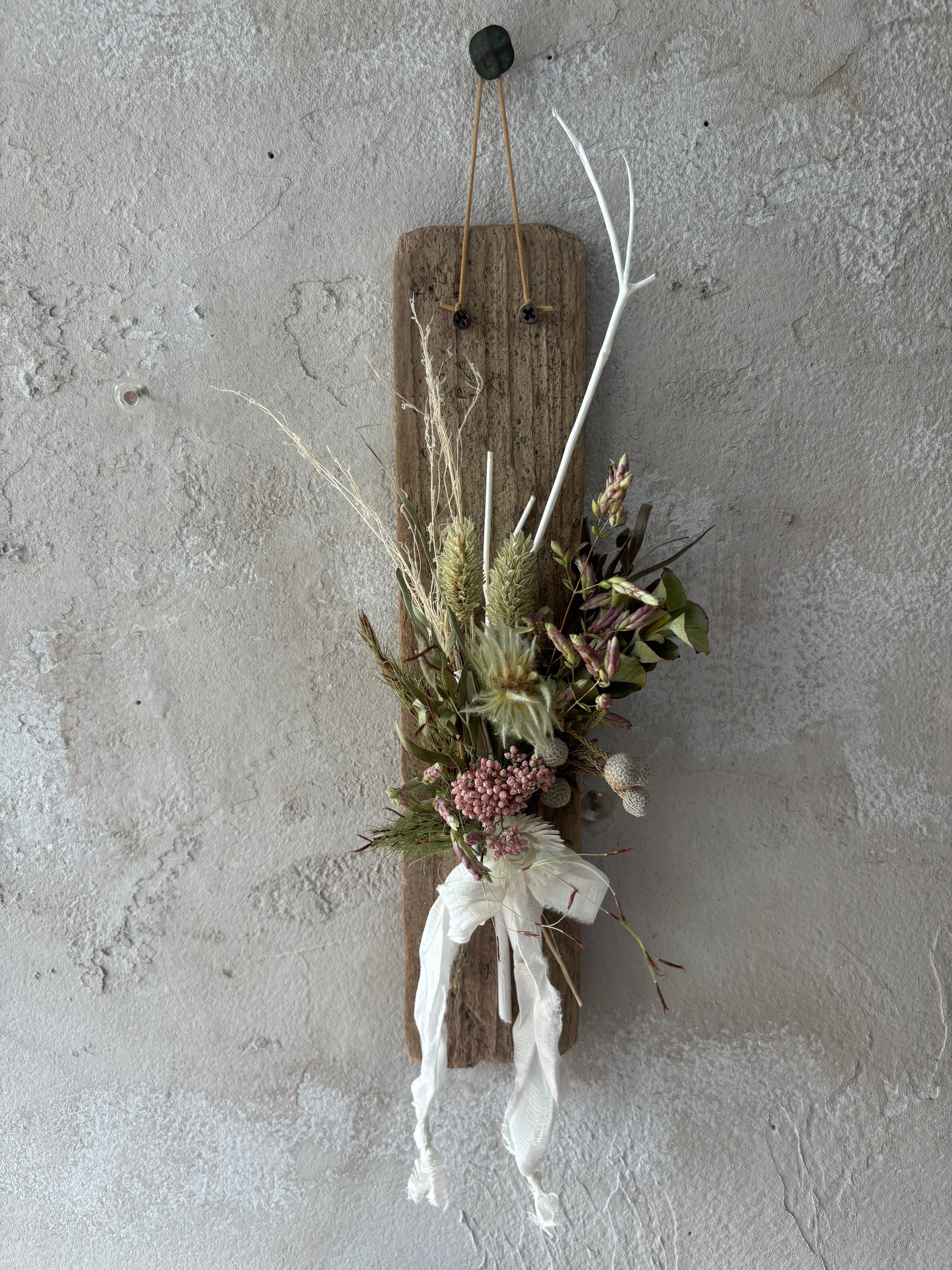 壁掛け流木プレートにドライフラワーをブーケのようにアレンジしました。